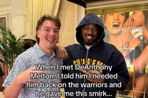被問到是否回勇士時(shí),梅爾頓只是笑笑沒有回答。之后梅爾頓與兩位球迷合影留念。