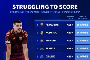 體育資訊10月25日訊 德國轉會市場盤點了進攻球員進球荒場次,并列出榜單,埃文-弗格森25場,羅德里戈24場。
