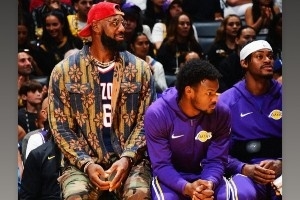 體育資訊10月26日訊 昨日湖人主場迎戰(zhàn)森林狼,詹姆斯身穿小兒子布萊斯在亞利桑那大學的球衣到場觀賽。