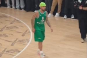 畫面中比伯身穿一件綠色6號球衣,頭戴“小綠帽”,連連得分。