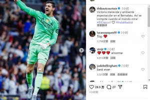 皇馬門將庫爾圖瓦社媒曬照慶祝勝利,配文:“實至名歸的勝利,伯納烏球場的氛圍震撼人心,在舉世矚目的比賽中就該有這樣的表現(xiàn)!”