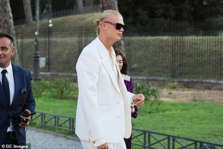 哈蘭德與女友一同抵達羅馬古羅馬廣場舉行的時裝走秀。哈蘭德身穿剪裁合身的白色兩件套西裝,里面是清爽的白襯衫。他還穿著一雙棕色絨面革休閑鞋,戴著黑色太陽鏡。