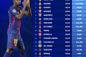 1.登貝萊(巴薩)17/18賽季 1.35億歐
