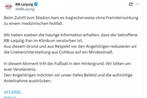 萊比錫俱樂部確認(rèn),一名萊比錫球迷進入球場時發(fā)生緊急醫(yī)療情況(與外部因素?zé)o關(guān)),被送往醫(yī)院,最終在醫(yī)院去世,萊比錫俱樂部社媒因此將這場比賽的直播報道減少到最低限度,并向家屬表示深切慰問。
