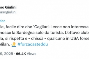 朱利尼寫道:“親愛的卡迪納萊,當(dāng)你對(卡利亞里主場所在地)撒丁島的了解僅限于游客視角時,說‘沒人關(guān)心卡利亞里對陣萊切的比賽’當(dāng)然容易。作為意大利球迷數(shù)量排名第八的俱樂部,卡利亞里既有觀眾關(guān)注,也備受尊重。而且誰知道呢,在美國,或許支持卡利亞里的人比支持米蘭的還多(注:在美國有很多來自撒丁島移民的后裔)?!?/p>