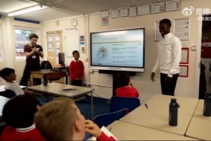 ????薩卡驚喜現(xiàn)身小學(xué)時期的母校,當(dāng)時孩子們正在做關(guān)于自己偶像的演講。