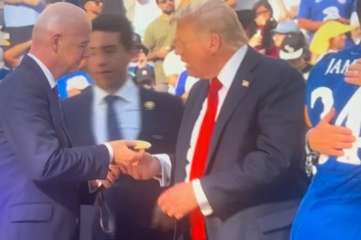 體育資訊07月16日訊 世俱杯決賽,切爾西3-0戰(zhàn)勝巴黎奪冠,賽后美國(guó)總統(tǒng)特朗普參加頒獎(jiǎng)典禮。在頒獎(jiǎng)典禮上,特朗普從國(guó)際足聯(lián)主席因凡蒂諾手中接過(guò)一塊冠軍獎(jiǎng)牌,隨后放進(jìn)了自己的口袋里。